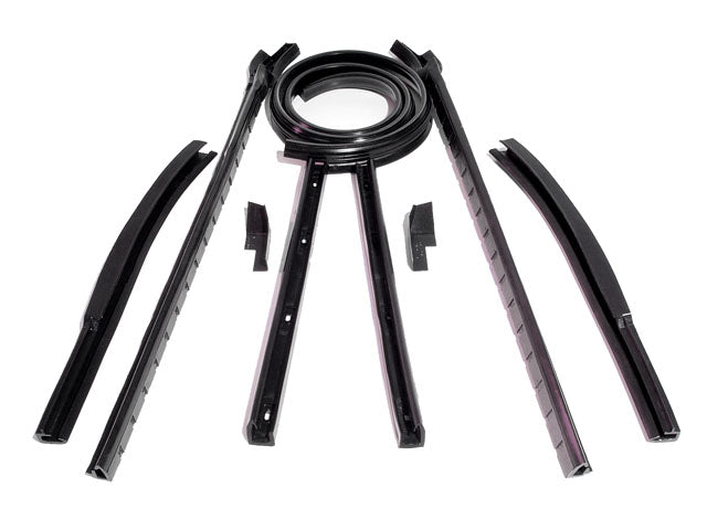 Is your hair blowing in the wind even when your convertible top is up?  We have the solution for you, this is a complete 9 piece convertible top weatherstrip kit for your 1963-1964 Ford Galaxie convertible.  This set includes the header seal (where the top frame meets the top of the windshield frame) as well as the seals that go down both sides of the convertible top frame, where the side windows seal against the convertible top frame.  This set is an excellent reproduction of the original with molded in steel cores and threaded studs and will fit great.