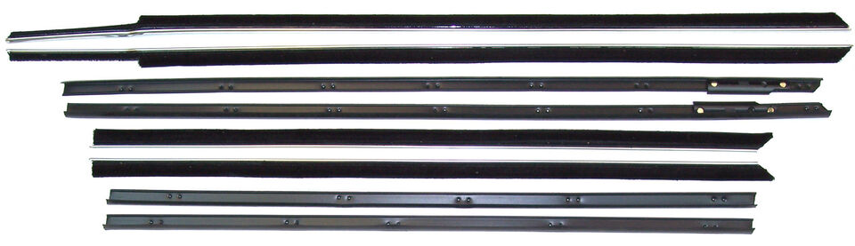 This is an 8 piece set of window sweeps (also called belt line molding, felts or fuzzies) for the 1963 & 1964 Cadillac Series 62 & Deville 2 door hardtop. The window sweeps attach to the top of the door panel on the inside and the top of the door on the outside. They have the felt or fuzzy material that touches the glass and wipe the glass as you roll the window up and down, they help keep water and debris out of the doors and hold the glass so it doesn't rattle. This is a 8 piece set that includes the inners and outers for both doors and rear quarter windows.