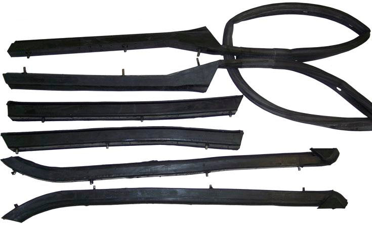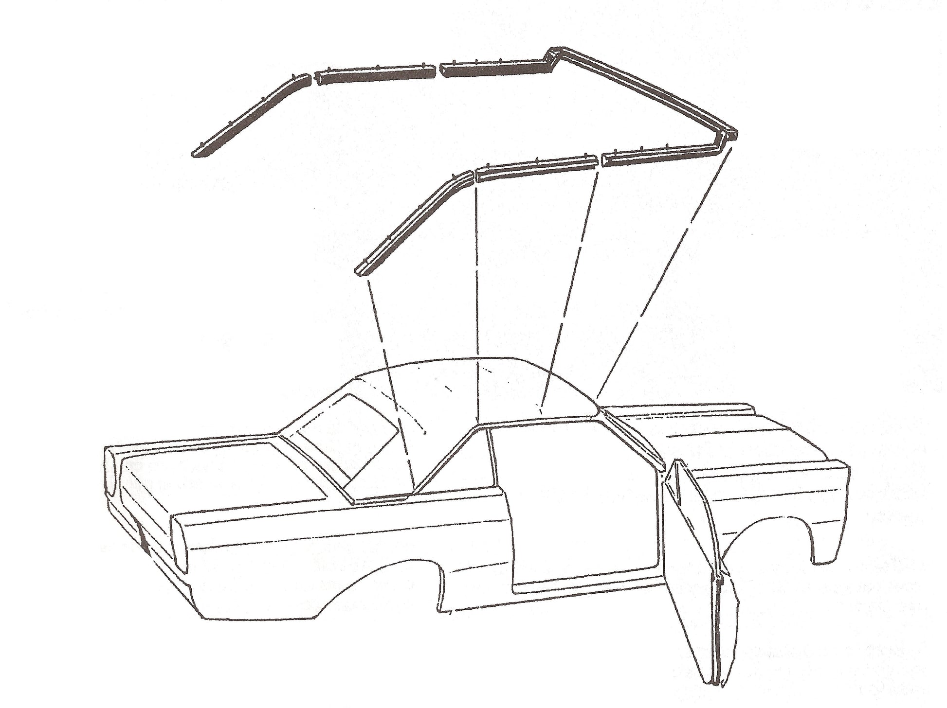 Is your hair blowing in the wind even when your convertible top is up? We have the solution for you, this is a complete 5-piece convertible top weatherstrip kit for your 1969-72 Ford Fairlane, LTD, Galaxie 500, XL & Mercury Marquis, Monterey convertible. This set includes the header seal (where the top frame meets the top of the windshield frame) as well as the seals that go down both sides of the convertible top frame, where the side windows seal against the convertible top frame. This set is an excellent reproduction of the original with molded in steel cores and threaded studs and will fit great.