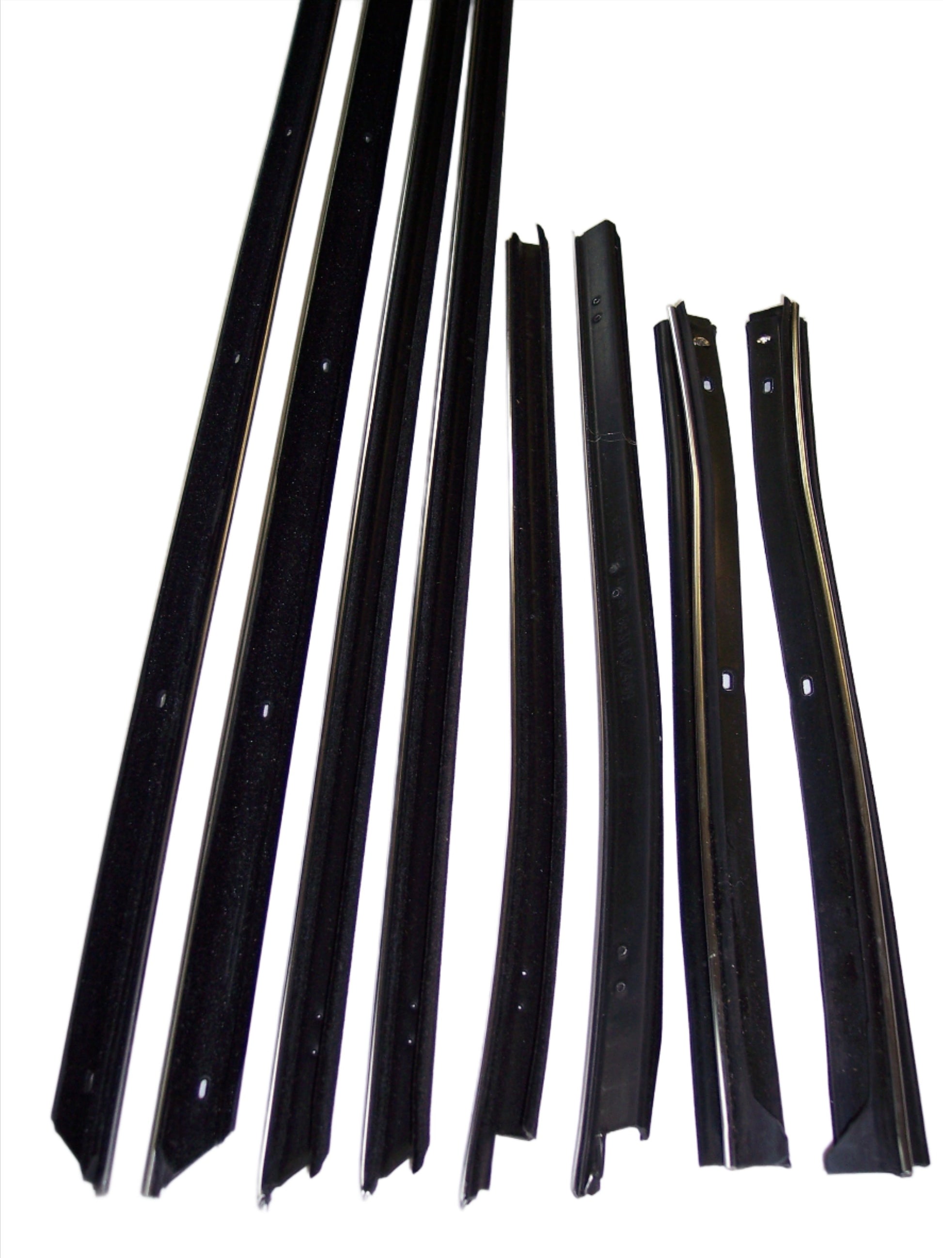 This set is contains 8 piece set to cover the front doors on the inside and outside as well as the quarter window sweeps for the inside and outside. This car could have come with 2 different types of window sweeps on the outside and it is important that you know which style you have. Some of the cars came with a chrome molding on the outside of the doors and it was actually attached to the car door, if you remove the window sweep the chrome piece stays on the door. Some of the cars came with the chrome strip attached to the window sweep so if you remove the window sweep the chrome strip comes with it. This set is for the cars with the chrome strip attached to the window sweep and not the car door.