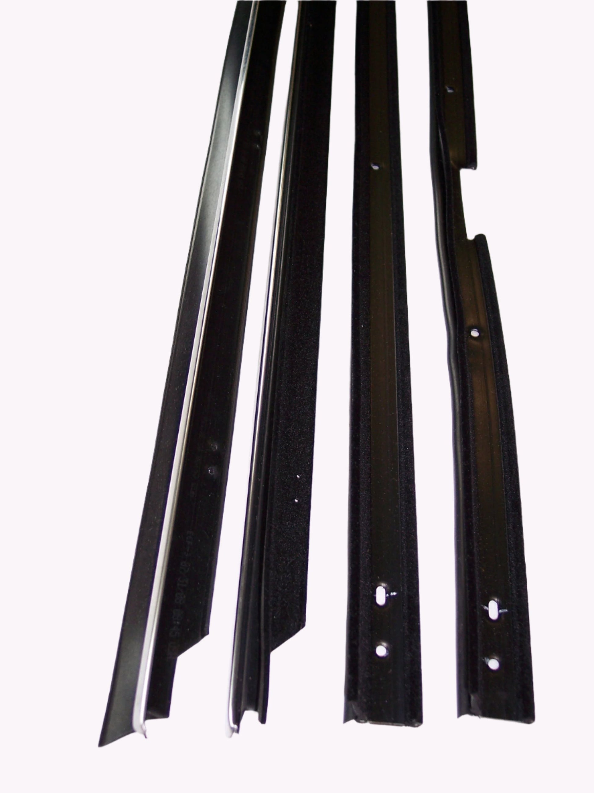 The window sweeps (also called dew wipes or felts) go horizontally across the top of the doors and touch the inside and outside of the glass, they keep the windows from rattling and 'wipe' the glass as it is rolled up and down. This set is contains 4 pieces to cover both doors on the inside and outside, without chrome on outer sweep, made just for your 1977-1979 Pontiac Bonneville 2-door Hard Top.